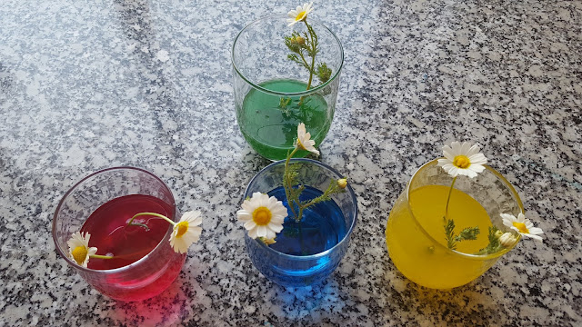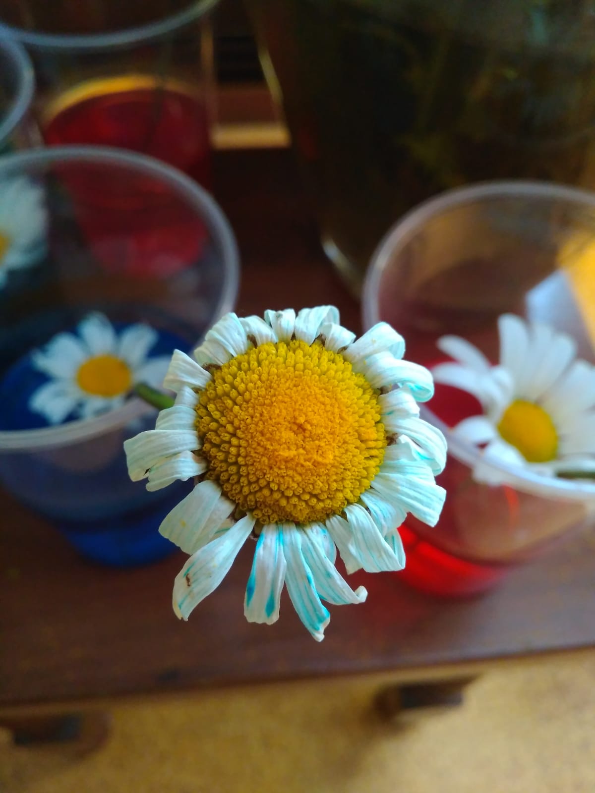 Hoxe na vídeo conferencia estivemos falando do experimento das margaridas. Aínda non vos ensinara o meu resultado, e a verdade e que desta vez o experimento non saliu moi ben. Pero aquí vos ensino algunha das margaridas que me colleu un pouco de cor, aínda que xa están algo murchas.