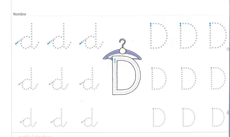 No primeiro traballiño decir en voz alta cal dos dous froitos empeza por "d". pintalo e escribir o nome.